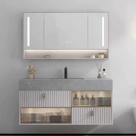 JH Modern klasik duvar montaj banyo Vanity cam ve kontrplak kabin lavabosu LED ayna ve seramik ile Set